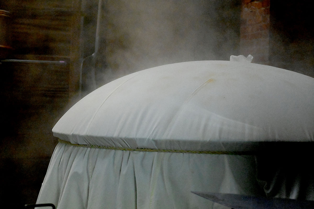 將水倒進鍋釜,經瓦斯灶爐加熱後會產生蒸氣。持續加熱讓鍋釜裡的熱水漸漸減少後,開始露出鍋釜的側面面積,這部分在瓦斯灶爐的持續加熱下會因此產生乾燥的蒸氣。利用這個乾燥的蒸氣來蒸酒米,能讓米的表面乾燥,成為非常好處理的外硬內軟的蒸米。